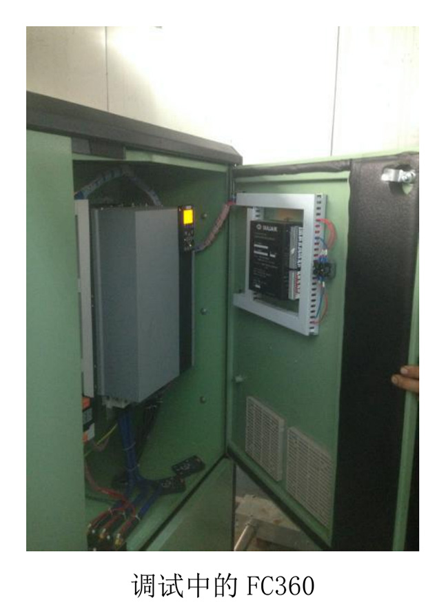 以上兩張圖片是我司在佛山某空壓機應用現場所拍,我司的技術工程師正在調試FC360變頻器??諌簷C變頻調速控制原理是電動機拖動空氣壓縮機旋轉,使之產生壓縮空氣,并存儲于儲氣罐中。儲氣罐中空氣壓力的大小取決于空氣壓縮機產生壓縮空氣的能力(本系統中即取決于電動機的轉速)和用戶用氣量之間的平衡狀況,為了保證供氣質量,要求儲氣罐空氣壓力穩定在某一數值上。儲氣罐內的壓力為被控量,壓力變送器將儲氣罐的壓力變換成電信號送給變頻器PID單元,與壓力給定值進行比較,PID能單元根據比較所得偏差的大小和方向按預定的 PID 運算規律運算后產生控制信號改變變頻器的輸出,從而改變電動機的轉速,使儲氣罐內的實際壓力始終維持在給定值上。