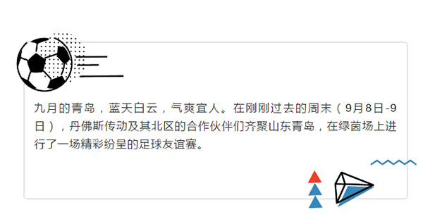 8日上午,在丹佛斯傳動中國區(qū)副總裁盧中平和北區(qū)合作伙伴代表北京聯(lián)澤總經(jīng)理劉劍濤的致辭中,足球賽拉開了帷幕!本次足球賽本著“友誼第一”的原則,為大家提供了一個既可以感受足球魅力,又可以相互交流的平臺。并以此為契機,激發(fā)熱情,強健體魄,凝聚力量!