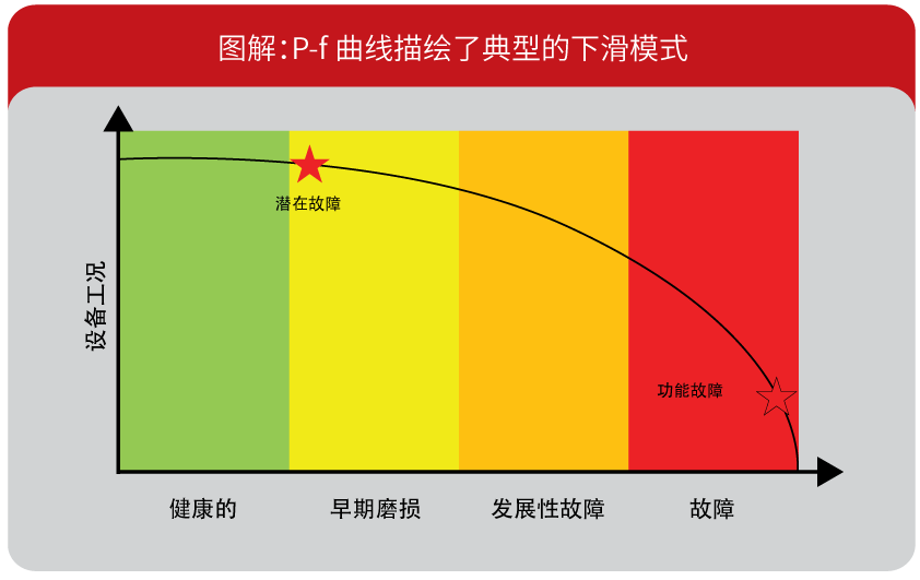 基于工況的維護是利用獲取的數(shù)據(jù)監(jiān)測現(xiàn)有設(shè)備的健康狀況。為此,要選擇關(guān)鍵參數(shù)作為識別發(fā)展性故障的指標。設(shè)備狀況通常會隨著時間的推移而下滑。P-f 曲線表明了典型的下滑模式。設(shè)備不能執(zhí)行預期的功能時,就會發(fā)生功能故障。基于工況的維護就是要在故障真正發(fā)生之前檢測潛在的故障。規(guī)劃維護措施的優(yōu)勢如下: