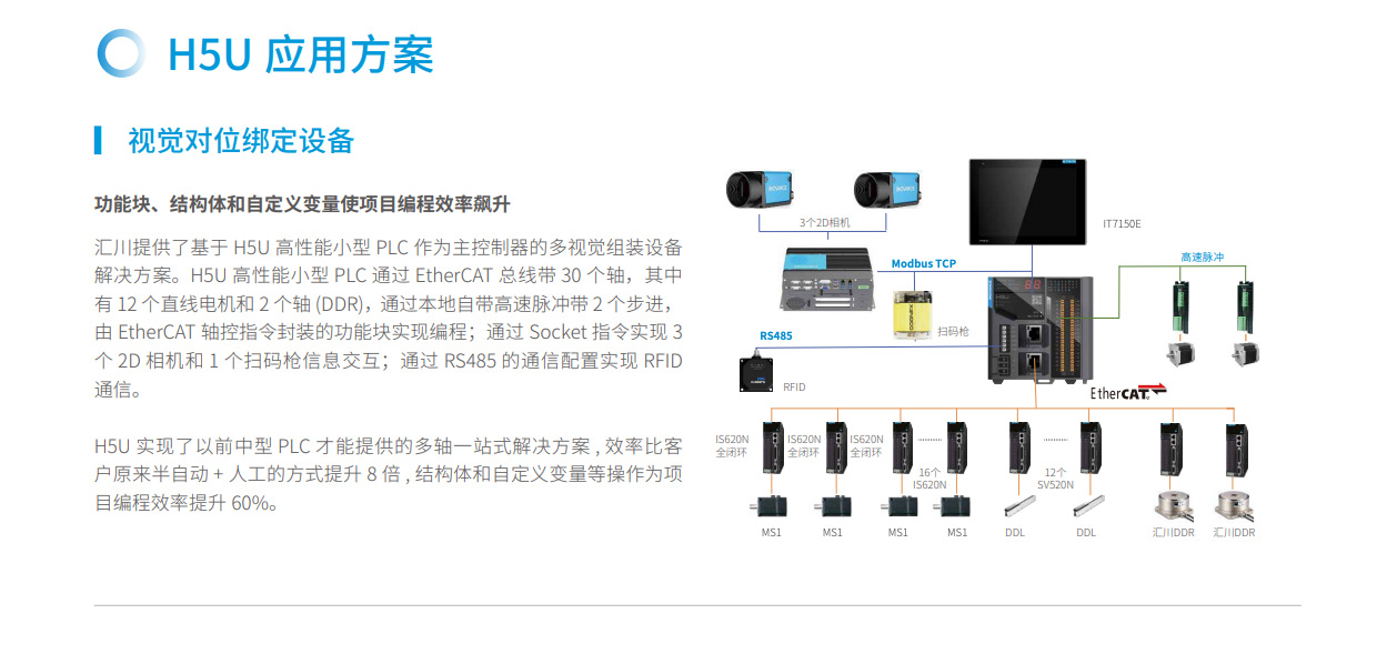 匯川技術推出首個應用EtherCAT 總線的小型PLC H5U,讓線體設備飛速運轉。隨著終端消費日趨升級,生產制造面臨巨大的壓力,而H5U 能夠簡化布線量、加快編程調試時間、滿足帶軸能力的要求以及嚴苛的成本控制需求,從容應對嚴峻的挑戰,是將EtherCAT總線應用到小型PLC 的先鋒之作。